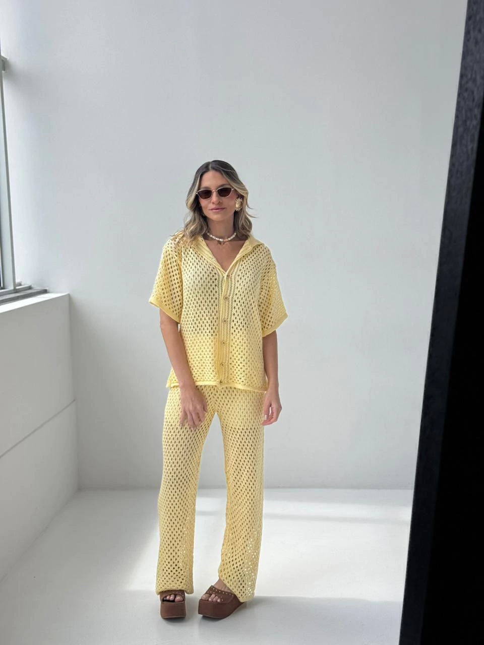 O Conjunto Íris é a combinação perfeita de conforto, sofisticação e praticidade. Produzido em tricot de alta qualidade, ele conta com uma camisa de modelagem soltinha e uma calça de caimento impecável, ideal para compor looks modernos e versáteis.
