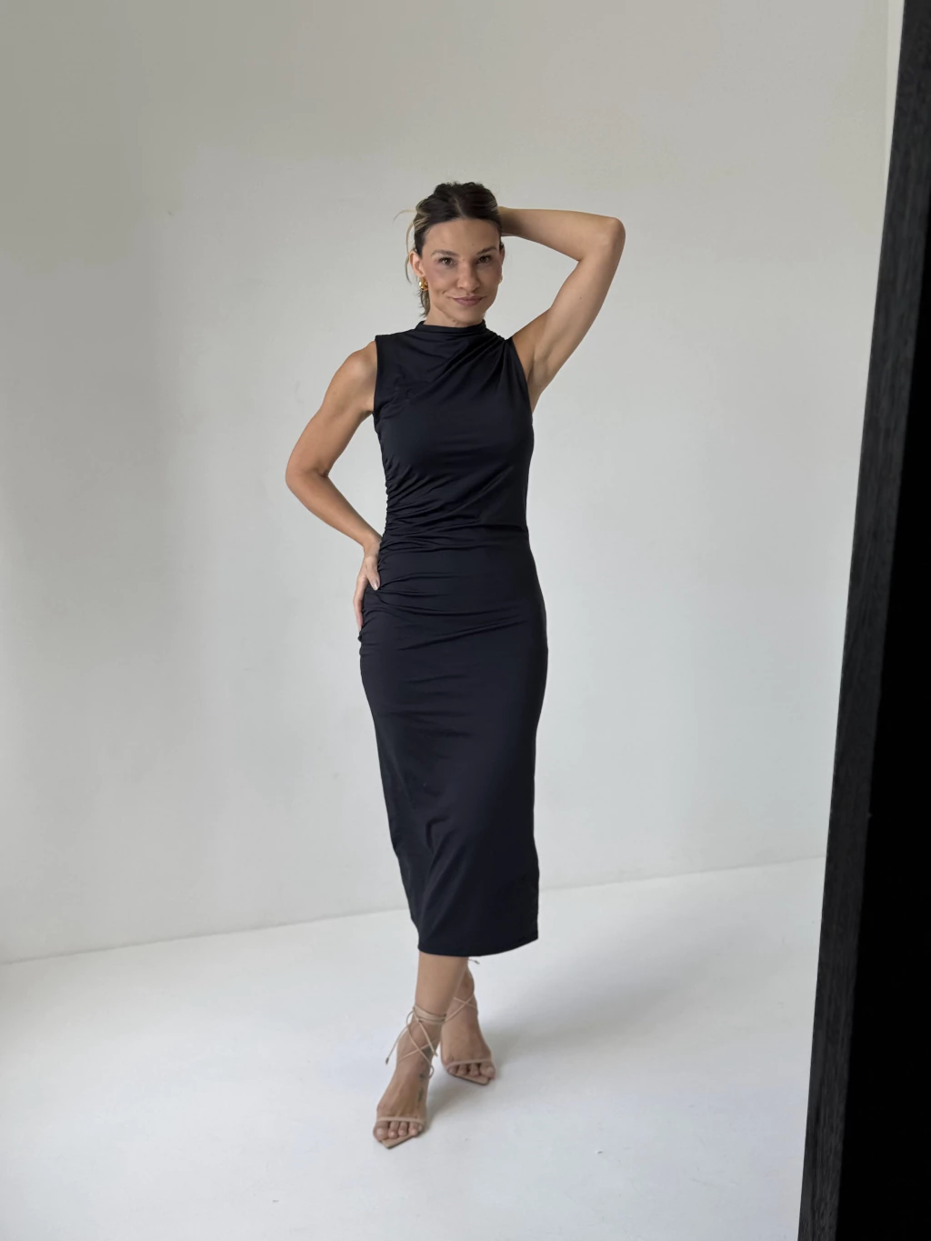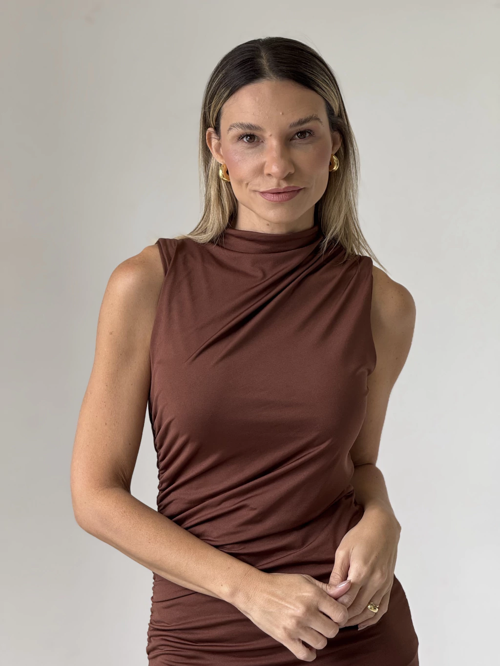 O toque especial fica por conta do drapeado lateral – um detalhe moderno que disfarça, modela e dá aquele charme a mais. Apesar de ser mais justo, ele não marca nada e veste muito bem em diferentes tipos de corpo.